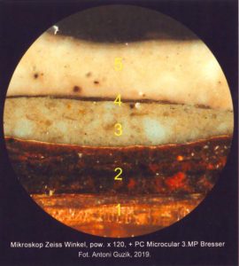 Warto w tym miejscu wspomnieć o oryginalnej kolorystyce ołtarzy i empory chórowej. Jak pokazały badania konserwatorskie pod mikroskopem (zdjęcie obok), drewno iglaste (warstwa nr 1), z którego zbudowane są te zabytki, miało pierwotnie kolor bordowy (warstwa nr 2). Dopiero w pierwszej połowie XX wieku przemalowano je na biało (warstwa nr 3). Kilkadziesiąt lat później znów przemalowano zabytki – również na biało, choć wybrano jaśniejszy odcień (warstwa nr 5). Nr 4 to prawdopodobnie warstwa brudu, który nie został wyczyszczony przed drugim przemalowaniem