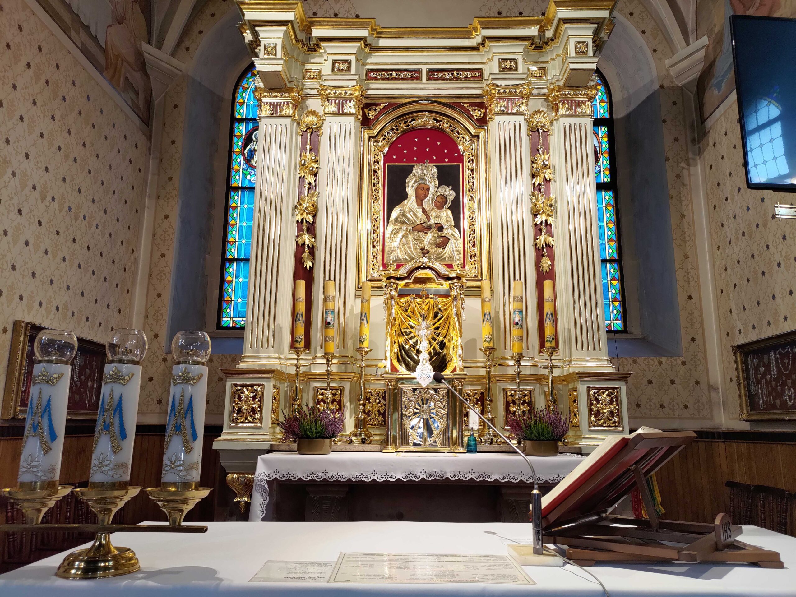 Podobnie jak inne zabytki – w tym te które do tej pory udało się odrestaurować, czyli ołtarze boczne oraz oprawa chrzcielnicy – ołtarz główny to eklektyczny zabytek wykonany przez rzeźbiarza Pawła Turbasa w XIX wieku. W części centralnej umieszczony jest łaskami słynący obraz Matki Bożej z Dzieciątkiem (XVII w.) z nałożoną złoconą i srebrzoną sukienką. Oryginalnie ołtarz główny polichromowany w odcieniach bieli i czerwieni, a w wielu częściach złocony i srebrzony. Niestety – w XX wieku ołtarz został dwukrotnie przemalowany, drewno zostało w całości zaatakowane przez owadzie szkodniki drewna, a w ostatnich dziesięcioleciach pojawiły się ubytki drewna i farby. Rozpoczęta renowacja ma na celu zarówno powstrzymanie destrukcji struktury naszego ołtarza głównego jak i przywrócenie jego pierwotnej estetyki. Wkrótce ołtarz znów będzie wyglądał tak jak 130 lat temu.