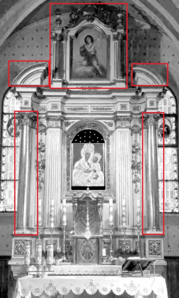 • prawej i lewej złoconej kolumny w centralnej części ołtarza,,